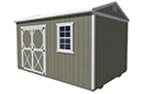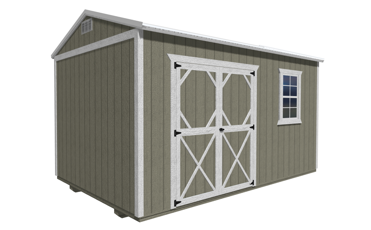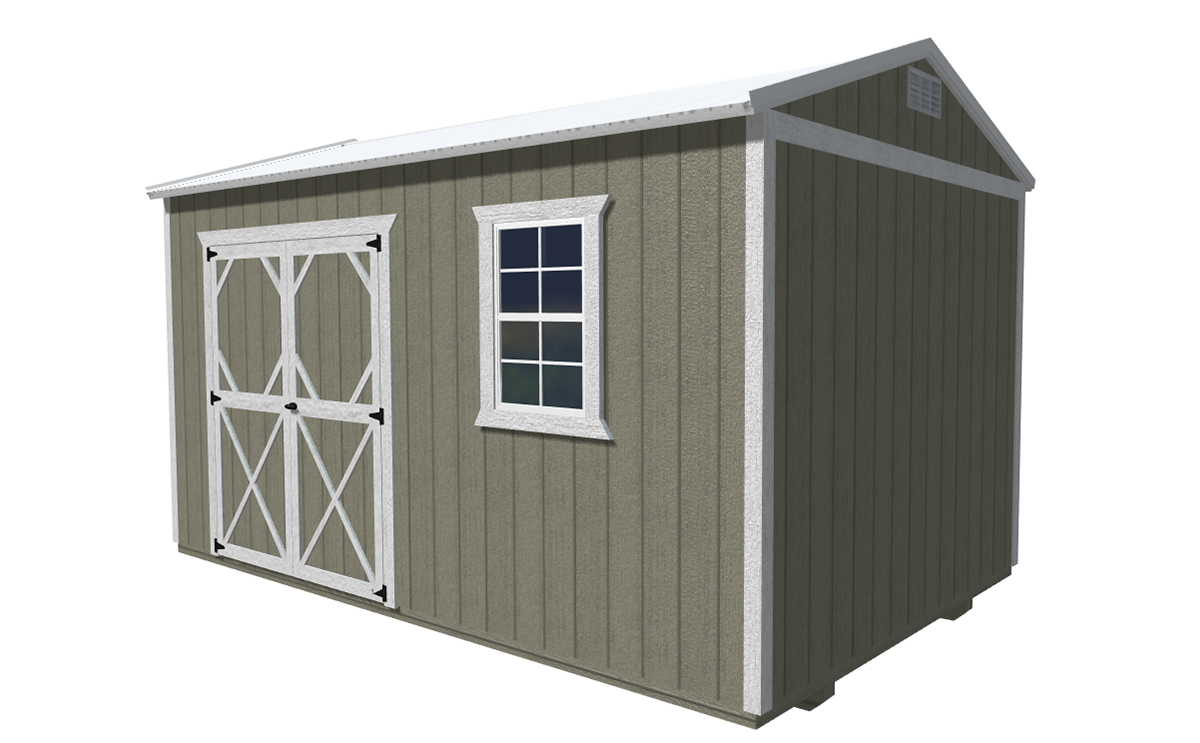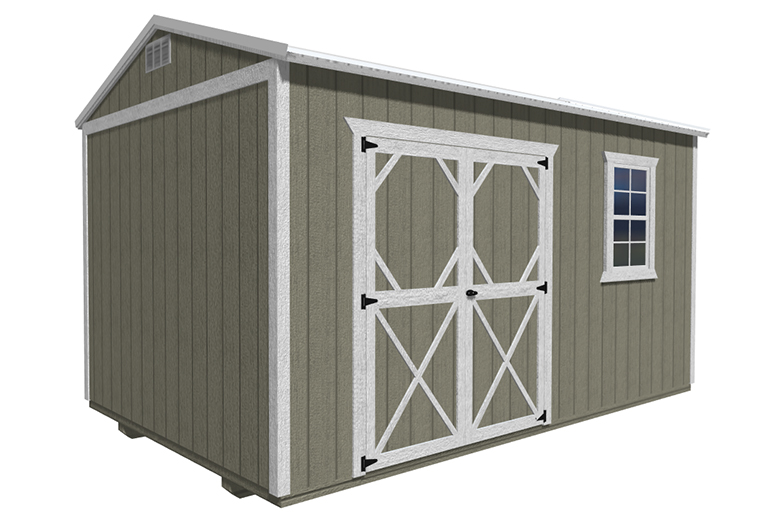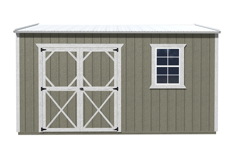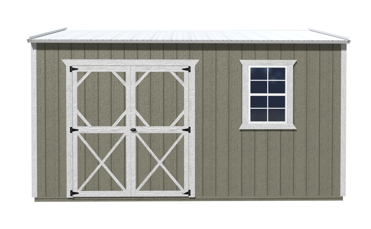 Features Include: 46 inch wood door for 8ft. wide buildings 72 inch double wood door in 10ft and 12ft wide buildings Buildings ≤ 10ft long – one 46” single wood door and one 2’ x 3’ window OR one double wood door Buildings ≥ 12ft long – 72 inch double wood door and one 2x3ft window 7’8” (8’ outside) standard wall height Natural Wood Buildings: Includes staining and water sealing the LP Smart Side with Honey Gold Olympic stain. Comes standard on all painted and urethane buildings. Painted Buildings: Includes painting the siding and trim with any of our standard colors. Custom colors are available for an extra charge.